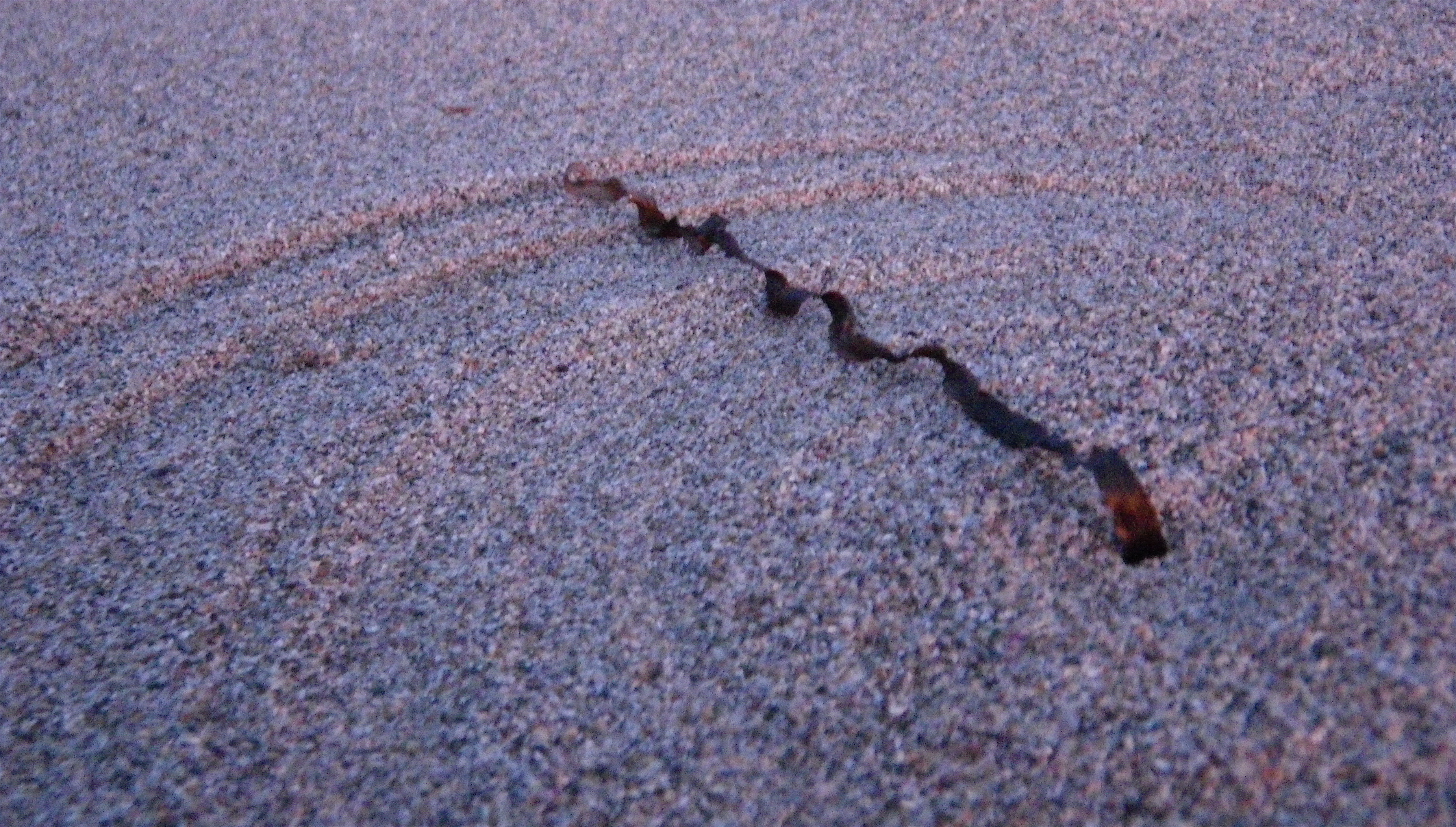 As I was headed home, I looked down at my feet to notice that there were arcs and circles all along the top of the beach. They reminded me of crop circles. The light was pretty well gone, and the flash flattened them out too much, but I got enough of a shot to give the idea of how they looked. Can you tell how these were made? (Hint: It was really windy yesterday.)