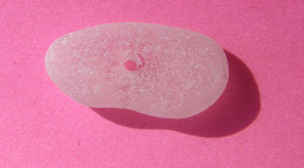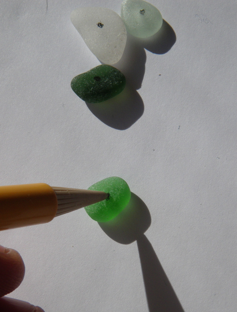 I still use the technique I described last March on my blog (Rock drilling 101) to drill beach rocks, and once in a while a few pieces of sea glass. Depending on the material I’m drilling, the drill bit will make a clean exit on the other side of the rock, but most of the time it does not. Especially with drilling glass, the exit end chips off instead of making a clean hole.