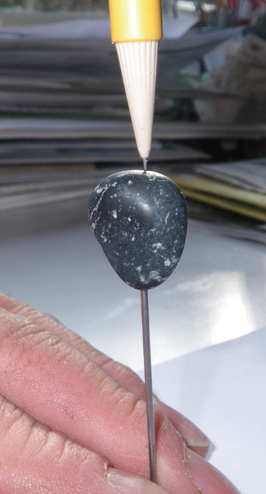 Even with the mark in the right place, I still have to be careful to place the rock at the correct angle in the hot glue to drill my way neatly through to the original hole. The advantage to drilling the first hole at least 3/4 of the way through is that you will know if your second drill hole goes deeper than 1/4 of the way through, you probably are not drilling in the right place.