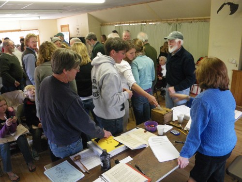 Most votes are hand votes, but ballot votes are required for town officers, selectmen and school committee members. Also a voter can make a motion to have an article voted on by ballot. (This is one of the few times a moderator might have time to pull out her camera to catch a few shots of voters, while they get a chance to stretch their legs.)