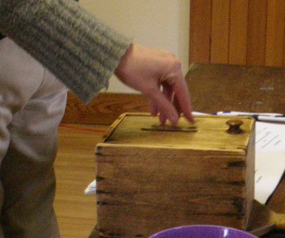 I would love to know if this ballot box dates back to the 1800’s when we became a town. Once votes are cast, inserted through the slot in the top, the top slides off so the box can be turned upside down with the handle and votes counted by the ballot clerks.