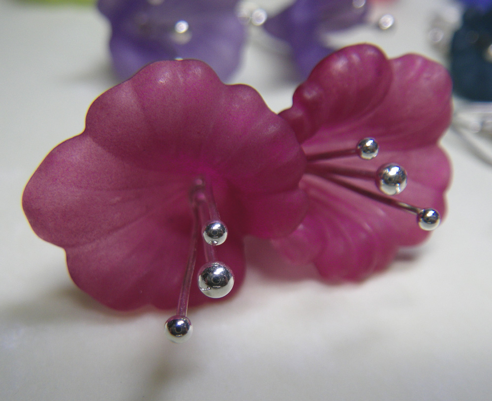 I picked up a bunch of these Lucite flower beads at the Beadin’ Path in Freeport, Maine in January. I just got around to finishing the silver wire pieces today so I could turn them into earrings. I love the Beadin’ Path. It’s one of the few bead shops I actually get to visit. It is “on my way,” whether I’m leaving or returning to Maine. If I can’t go there in person, they have a great shop online. I usually buy vintage glass, stone beads and freshwater pearls, but I cruise through the Lucite section because I like the colors, and a lot of the pieces are vintage.