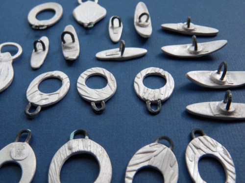 After two productive days of making toggle clasps, I had visions of spending some very happy time at my stringing bench. (Where I always keep my Argentium wire…I thought. Its on the other side of the room from my metal clay bench.) I opened the kiln and was shocked to realized that what I thought was fine silver wire had turned black and weak during the 2 hour firing. All of these bits broke off easily from their pieces. There was no resurrecting this mistake.
