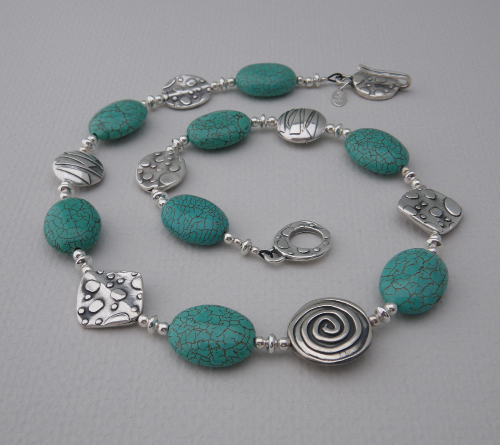 Once the first batch was fired, I stacked these little components on the pins with the ball ends, and cut out ovals of textured PMC, 7 cards thick. I imbedded the posts into these fresh PMC pieces and let them dry before firing. I did wonder how the copper/bronze discs would withstand a 1650º firing. It seemed hot for the bronze. Then I started wondering about fire scale on the copper, if it was reheated in the open air during the firing of the silver. So I fired the second batch at 1500º for an hour and a half. Fingers crossed that this would be long enough and hot enough for the silver clay t0 firmly hold the embedded head pins. When the firing was done, I removed the pieces while hot and quenched them in cold water; hoping that would help with fire scale on the copper.