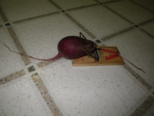 Well…….Eliza and I were just wondering who should get it next. We put it back at Anna’s. Now that the beet/radish is really shriveled, it looks even more like a dead mouse! Maybe it needs to make its way around the North Shore of the island!