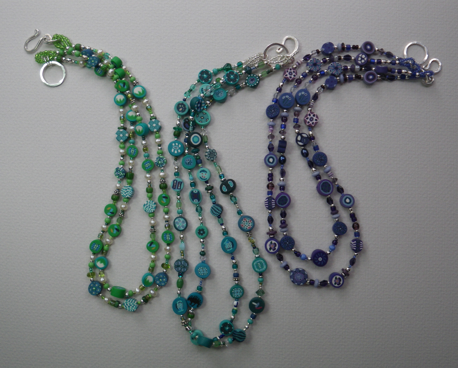 So, I gave it a whirl with updated versions of some necklaces I used to make. I’ve run into several people lately who were wearing earlier versions of these designs. They all said, “You know, I still get comments on this necklace.” I thought I would try a few on my Etsy site and in some of my summer time galleries. It might be a step backward, but I keep dreaming about polymer clay and all of the new techniques that are around since I made these beads 15 years ago. Maybe playing with these beads will head me in a new direction of polymer clay beads to combine with metal clay.