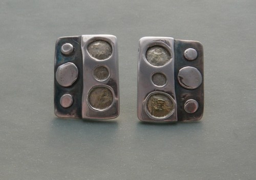 What I love when I look at these is that they were made when I did not know you could smooth edges with an emory board before firing. They mark a time before I had ever used PMC sheet and punches. The holes were made with drinking straws because I did not have any fancy little brass tubes to make perfect cuts. The edges were smoothed and the corners were rounded with a file after the earrings were fired. The hint of gold  in the recessed circles was my first attempt at using Aura 22 before I learned how to keum-boo.
