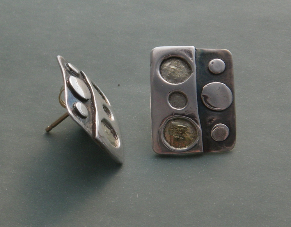 …to a time when I did not have much experience with PMC, but I knew I loved it. In July, my sister-in-law Karen asked if I would put some gold posts on a pair earrings I gave her a hundred years ago. The sterling posts were starting to irritate her ears. “Absolutely no hurry. Just when you get around to it.”  (Words that always give me way too much time to procrastinate. Things get lost in my studio when they fall into the “no hurry, really” category.) So, now it is almost the end of October and Karen and her husband headed back to Baltimore today. It was the deadline I needed to change the posts on her earrings before she left.