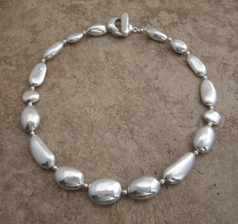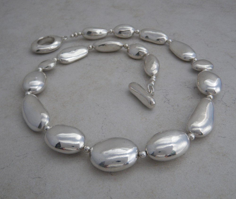 What an honor to donate one of my pieces to this worthy cause. It is also an honor to be attending as guests of our friends Dan and Cynthia Lief, parents of Ubuntu’s founder, Jake. ( Two images of the necklace, because I didn’t have any more time to try for a better shot. My usual amateur photographer’s lament!) The 18″ necklace consists of fine silver hollow beads, formed from silicone molds of Islesford beach pebbles.