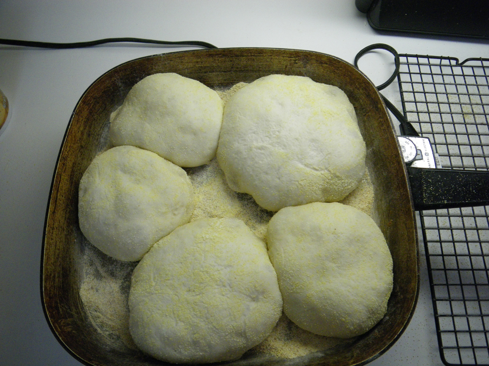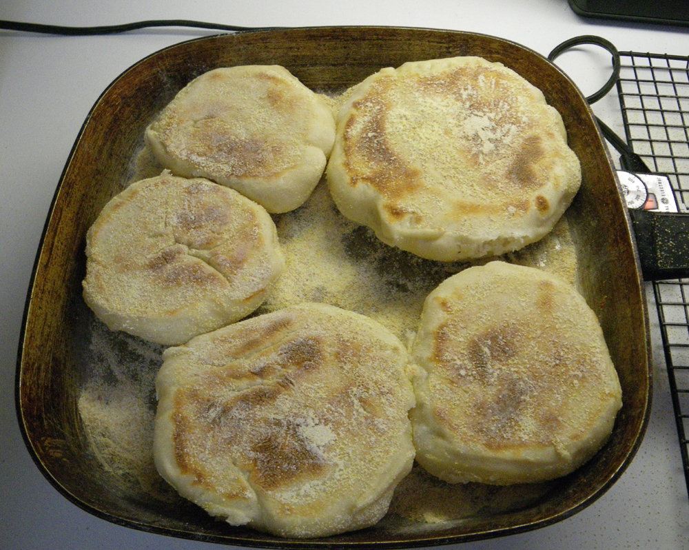 I think I am finally finished. Ready for the holiday. Literally wrapped up. If it’s not done now, it’s not getting done. We’re off to Portland for Christmas with our sons. Yee ha! One of the last things I finished making this morning, was a batch of English muffins. Something I can show you, and proudly too. This batch was an experiment; the first time I used only the sourdough starter I captured from wild yeast last summer. I haven’t trusted the starter to be active enough to rise a huge batch of dough, that gets handled this much, so in the past I added  just a little yeast to the starter to give it a boost. Not this time. I’m happy to say that “Wild Miss Islesford” is one active mother!