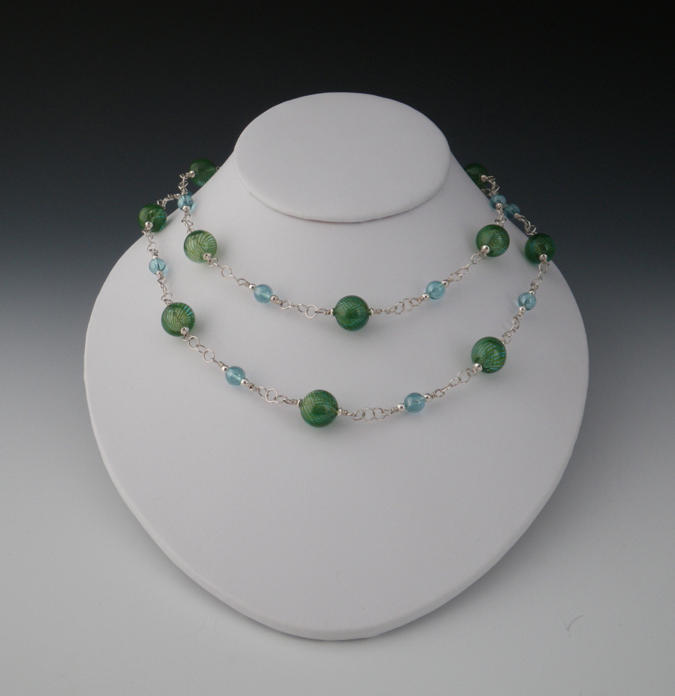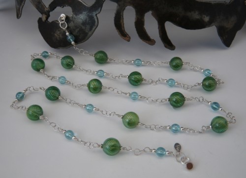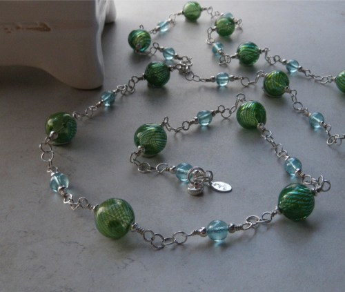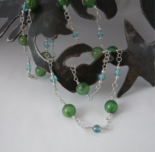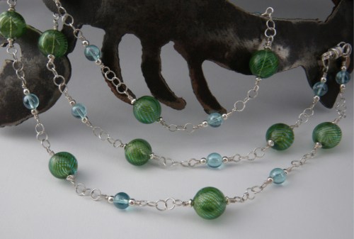 I began with a piece that was a challenge because the combination of chain and glass beads resulted in a necklace that does not drape easily, except around a human neck or on the leather display neckpiece that I am oh so tired of using. I looked around the immediate space where I was taking photographs, to see if there was a prop to try out. I wasn’t very happy with the results, so I stopped, and returned to the challenge today.