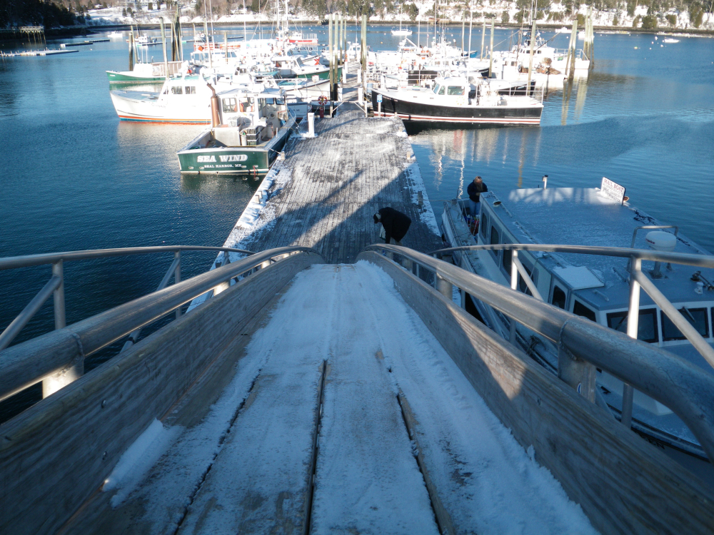 Just to the left of the ramp is a freight ramp. Can you imagine how fast my 40 lb. bag of birdseed slid down this icy sucker? It landed halfway across the float, beyond the stern of the mailboat. Whee!