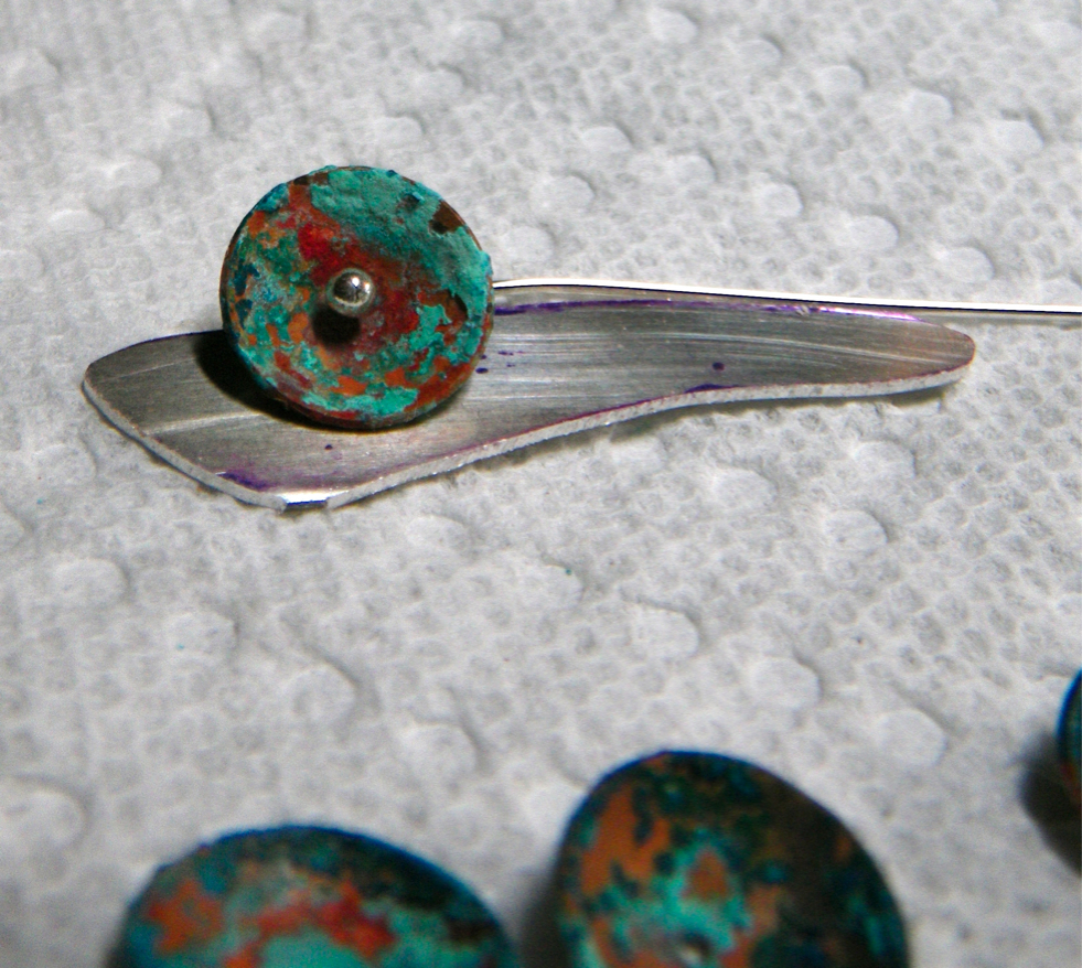 Once I came home they were dry, but the green flaked off easily. So I took them to a ventilated spot and sprayed them on each side with a fixative spray. When they were dry (a day later) I used Renaissance wax to seal them again. I’m not sure how much this will protect the patina. But I’m not planning to wear these as beads next to my skin or clothing. I’m going to rivet the discs onto silver shapes for a dangle earring. As with any new design, I’ll test it out myself, first, for wearability.
