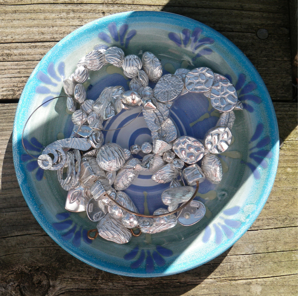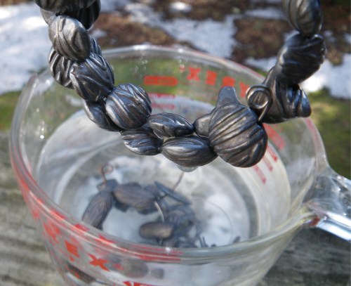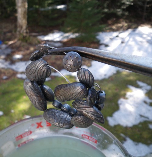 It was a good day to work with liver of sulphur on the back porch. (No stinky rotten egg smell inside.) I had plenty of silver beads waiting to be oxidized, sitting on this pretty little plate made by Kaitlyn Duggan. It was so bright on the back porch I had to move the beads into the shade to photograph them.
