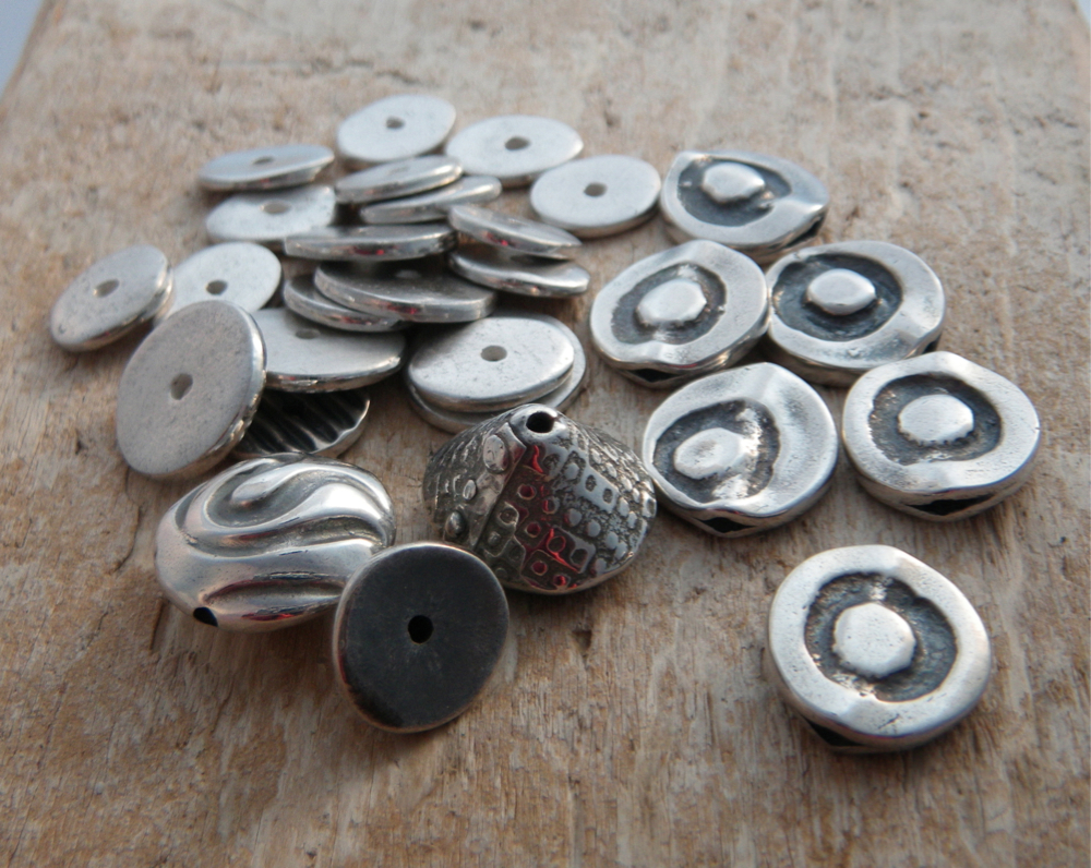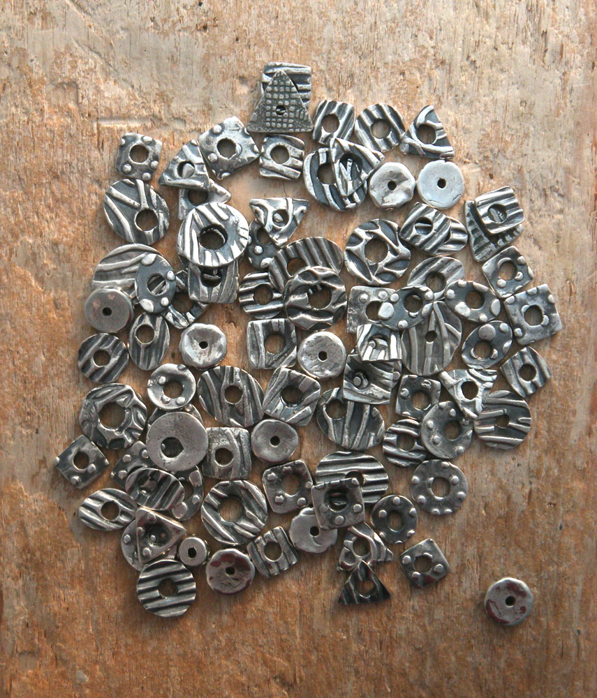 I have quite a collection of handmade PMC beads I need to finish. They are fired, tumbled, and many of them oxidized. I like a highly polished finish on some of my beads, and I know I can achieve that with a buffing wheel. The fine silver PMC polishes up beautifully on a muslin wheel with a little bit of polishing compound, but I put it off for as long as I can. It’s a dirty noisy process requiring a mask and eye protection, and those beads get hot really fast. I thought I would get it over with this morning, but I went to my studio and found plenty of little pieces to hand finish with polishing paper so I wouldn’t have to use the buffer until after lunch.