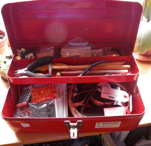 Th tool box goes with me to workshops, craft fairs, and just about any artistic endeavor. This time, I figure it won’t melt if I drop some hot glass on it.