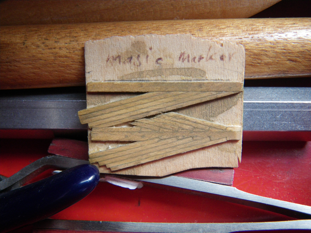 This is something I keep in my tool box, always. A little scrap of wood with sample stains for the deck of a ship model. My father was a model maker after he retired from Kodak, and he had bits like this all over his work bench. He passed away 15 years ago, but he always feels close when I grab my toolbox to head out on another artistic adventure.