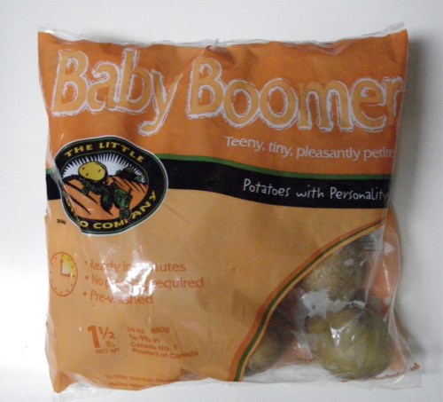 I couldn’t believe there was actually a package of potatoes called “Baby Boomer.” Cutesy packaging that I would have avoided, even if I am a boomer myself. But, they were only 99¢, a manager’s special, and I had a recipe for tiny potatoes that would cook fast. Into my cart they went.