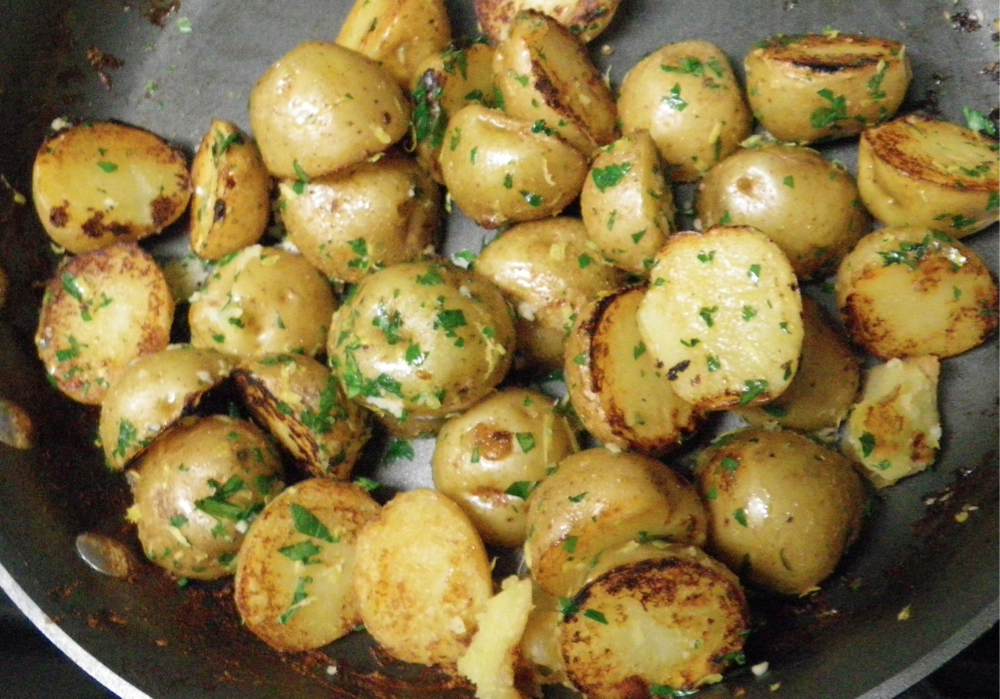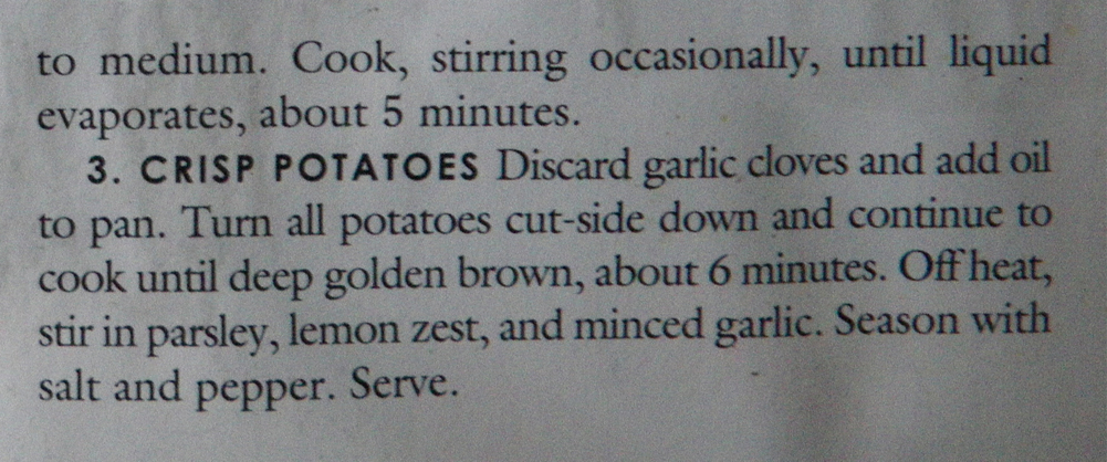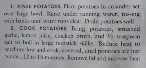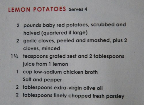 The recipe, one Bruce served a month ago, is from Cook’s Country magazine. A most delicious lemony garlicky way to cook little red potatoes. (Though in this case the 99¢ Baby Boomers were white.) It only took about 20 minutes, made on top of the stove, which gave me time to whip up the salads and heat the rotisserie chicken. On a night when I really didn’t feel like cooking, I had a tasty dinner ready, with a cleaned up kitchen, in just 30 minutes.