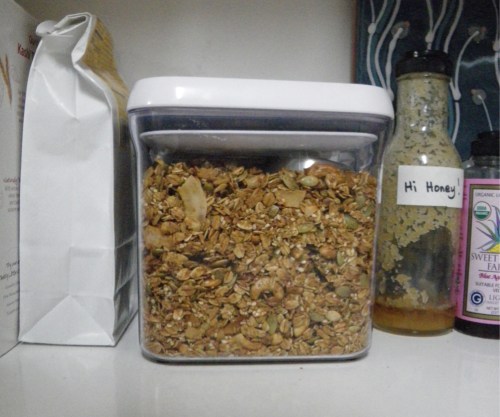 I worked in the studio today, stringing some necklaces that I hope to photograph tomorrow, and send to Red Dot Gallery on Deer Isle. It wasn’t until dinner time that I tried to address the rest of my list. I made dough for oatmeal bread so it could rise while we ate. After I cleaned up the kitchen I mixed up a triple batch of granola. (Triple because if I have to sit around for an hour stirring one batch every 10 minutes, I might as well have three batches in the oven. Easy enough to do with a convection oven.) While the granola cooked I picked out crabmeat to take to Susie and to have for crab cakes tomorrow night.