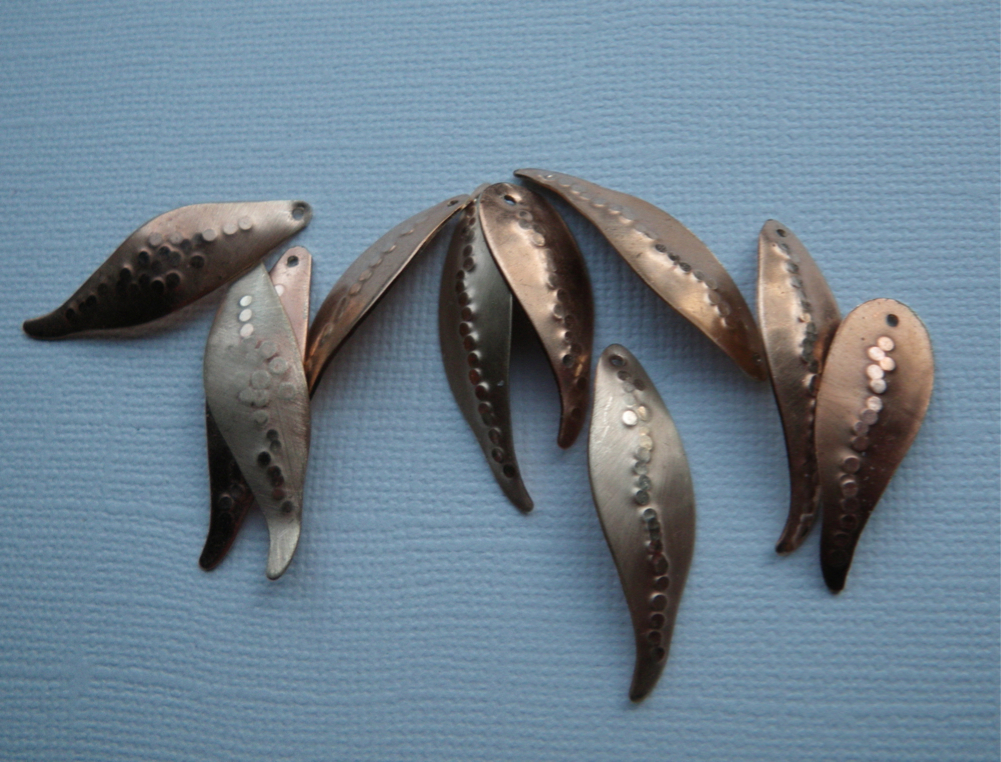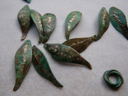 My favorite pieces this time are the copper leaves I filed down and stamped, to give them a little personality before I colored them with patina. These will become earrings just as they are, or with some extra silver components.