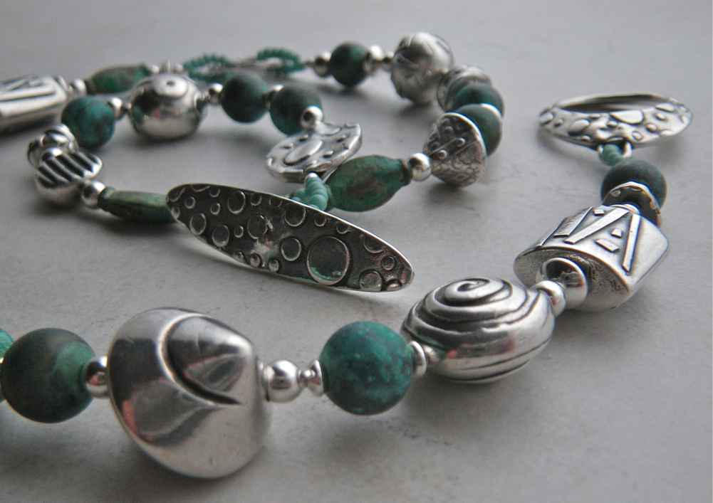 This necklace shows a little history of my bead making with precious metal clay. The toggle clasp and washer beads are from this year, and most of the others were made in previous years. The beautiful round patinated copper beads are from Shannon LeVart of Miss Ficklemedia. Her range of patinas inspired me to find some of my own copper components to try my hand at patina. The smaller, flat oval-shaped beads are from my first attempts with Shannon’s Verdigris patina.