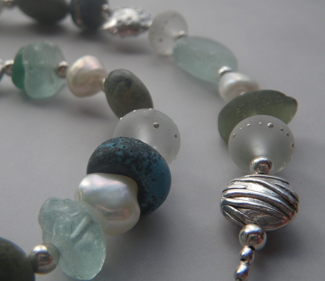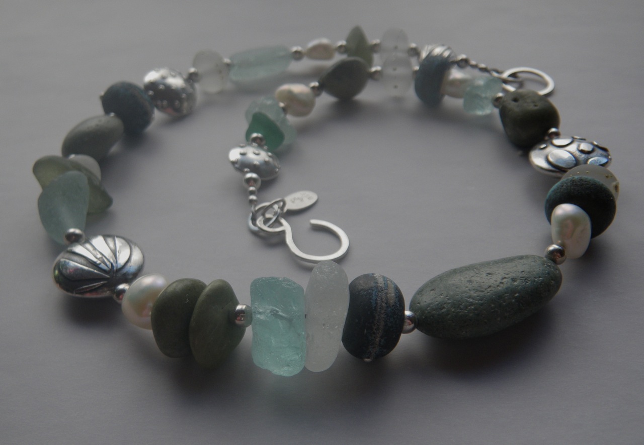 The necklace I worked on today is a combination of handmade lampworked beads, (bought from *artists on Etsy) local beach rocks, my own fine silver PMC beads and some local bits of sea glass.