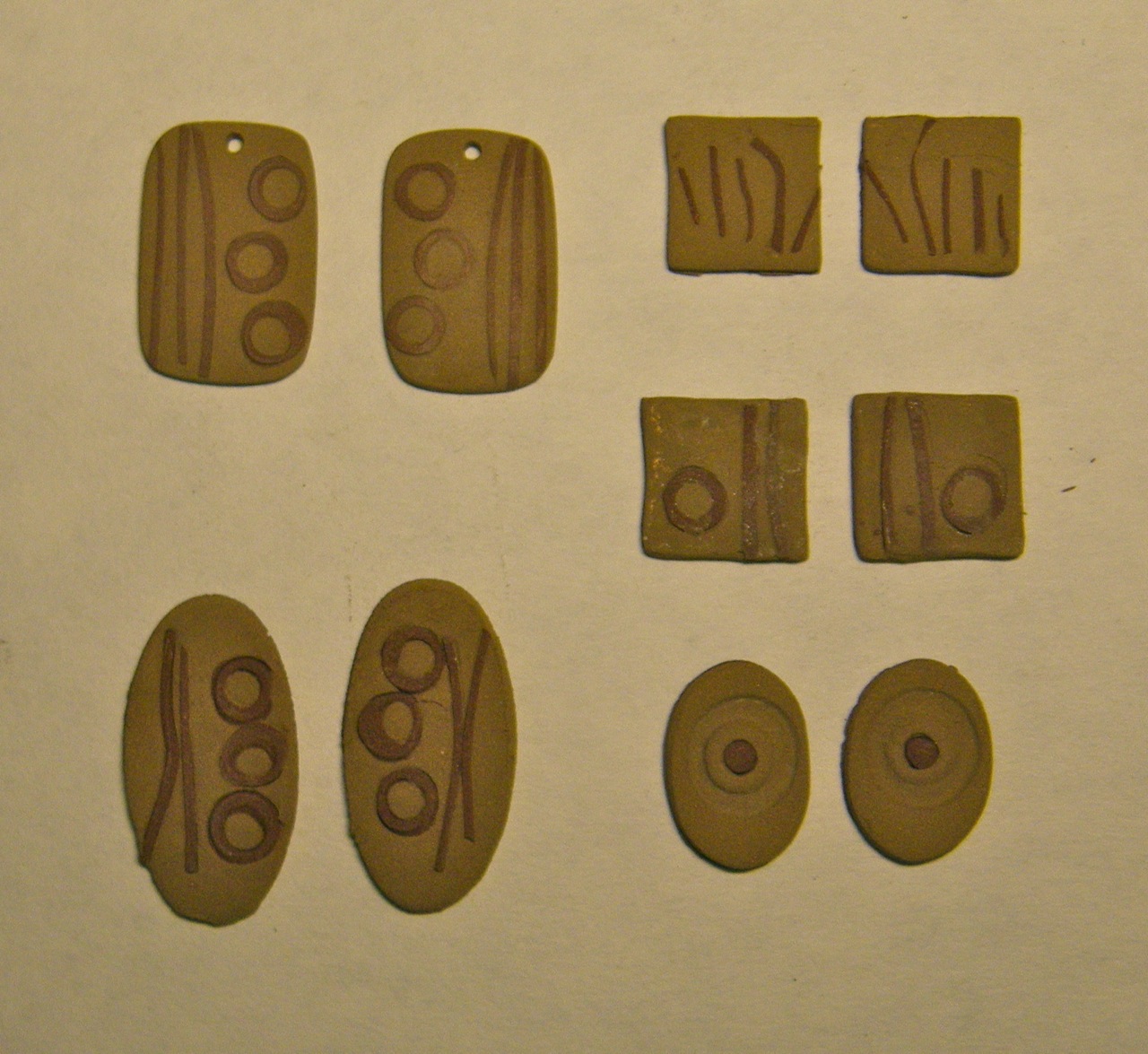 Similar pieces, after drying and sanding. I’m pretty sure I sanded the piece on the right a little too aggressively. The middle circle looks blurry, probably because it was almost sanded away. The embedded copper was 3 cards thick, and the bronze clay was 6 cards thick.