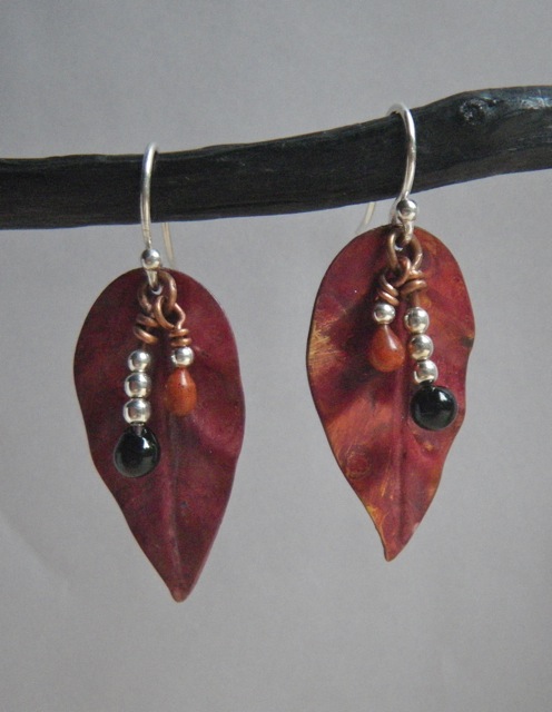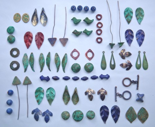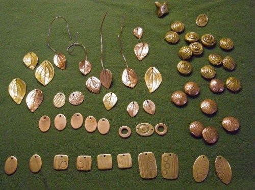 What excites me about the bronze and copper clay pieces is that I have a whole selection of patinas to use that I purchased from Shannon at Miss Ficklemedia. I already know from some patinas I tried last summer that the combo pieces, made with both base metals, take on the patina as if they were just one type of metal. The little two tone earring components will be used as they are. But the beads! I can’t wait to try Shannon’s russet red on some of the copper and bronze lentil beads. Picture the red color from the leaves below in the background of the raised letters and spirals in the 2 middle beads below: