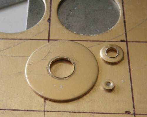 The learning curve was not too steep. I spent a pleasant afternoon working my way through various sizes of discs and familiarizing myself with my new tool. I quickly learned it was better to start with the smallest disc and work up in size. (It is too hard to center the hole in smaller and smaller pieces, which is how I tried it the first time around.) I spent the extra $57 for the Center Positioning Die set. That seemed pretty steep to me, but I still bought it and I’m glad I did. It will pay for itself in time saved when cutting out a series of washers. Here is one of the progressions: