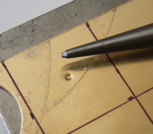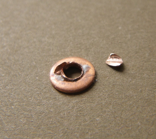 …I sure wish I had taken the time to drill a little hole in that indentation I made with the center punch. Then I would have had a usable piece from the first cutout. It’s so tiny, that it’s almost impossible to hold while drilling a hole in it, so it becomes an unusable scrap. With a hole in it, it would have become a nice little mini washer. A decorative element for a rivet. Live and learn. I ended up with a number of these before I thought about taking the extra step to drill them first.