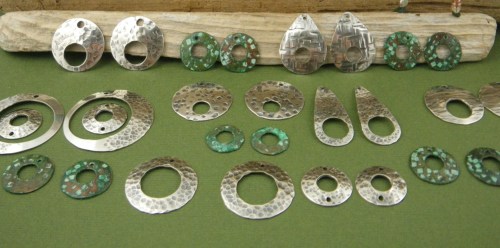 I hammered and patina-ted the copper and brass pieces, and I hammered, oxidized and hand polished the silver pieces and ended up with a nice collection of components to work with. (I didn’t get a shot of the whole batch, but you can get an idea from this.)