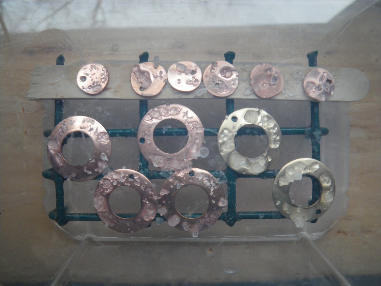 That’s what I used to patina some of my copper pieces recently. I dipped the metal in vinegar and placed it on a little rack inside a plastic container. I then sprinkled the vinegar-damp pieces with large-crystal sea salt. A shallow layer of ammonia covers the bottom of the container. The rack allows the pieces to sit above the ammonia to be exposed to the fumes.