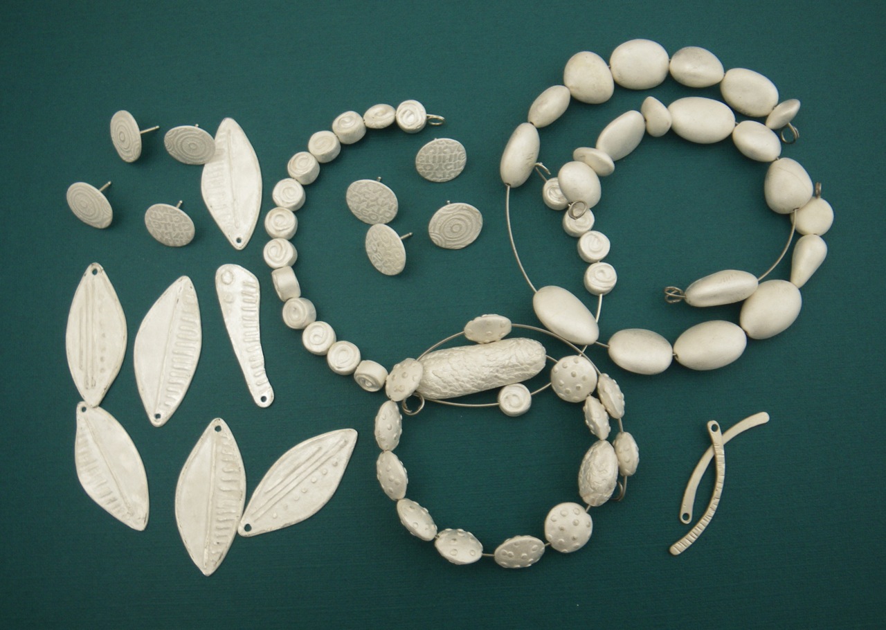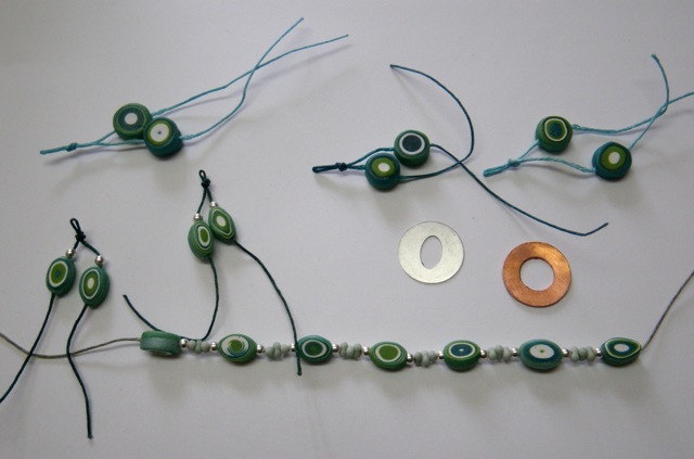 The time went all too quickly. Two morning sessions were just enough to whet our appetite for more polymer clay exploration. We were having too much fun to stop and take photos of it all. Here are two more test pieces, with beads added to the waxed linen before squeezing the two sides of polymer together. In my mind they would be earring components.