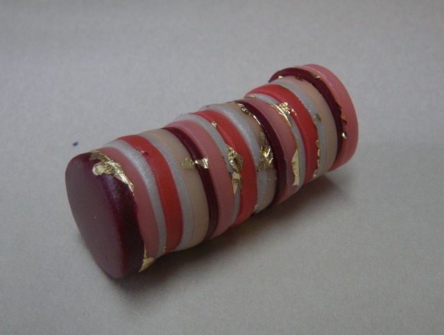 Holly tinted Premo translucent clay with alcohol ink and alternated her translucent slices with light and dark solids. She used gold leaf between her slices.