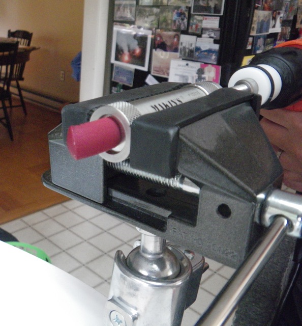 When in doubt, we get out the polymer clay. I planned ahead for her visit because I was fascinated with the idea of using an extruder to make thin canes of varying color that I think are called rainbow canes. (I’m confused about the terms “pixilated cane” and “retro cane.” I think they apply to larger canes of polymer clay made from combining these small thin extrusions.) All I know was that we wanted to extrude clay using the technique described by Cynthia Tinnapple in her Polymer Clay Daily blog. We wanted to see for ourselves how the stacks of color keep pushing through each other and changing as they are extruded through a smaller opening, but we didn’t want to wear out our wrists cranking the tiny handle of an extruder. I ordered the stainless steel extruder, adapter, and vise suggested by Cynthia, before Holly arrived.