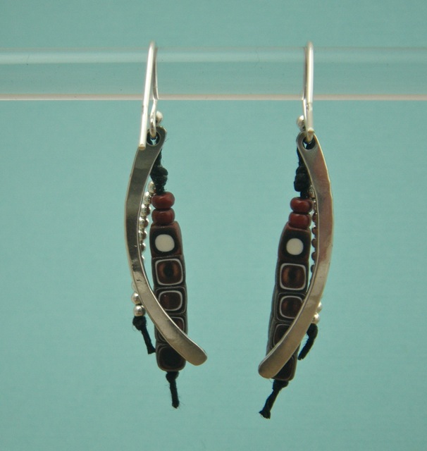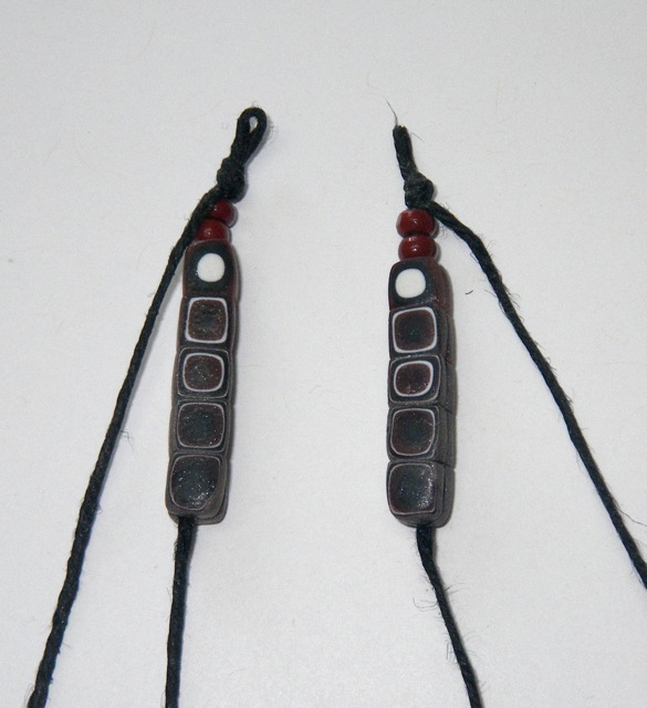The translucent segments show up a little bit in the finished earrings. What looks like a black stripe in the second segment from the top is actually the linen thread showing through the translucent part of the cane.