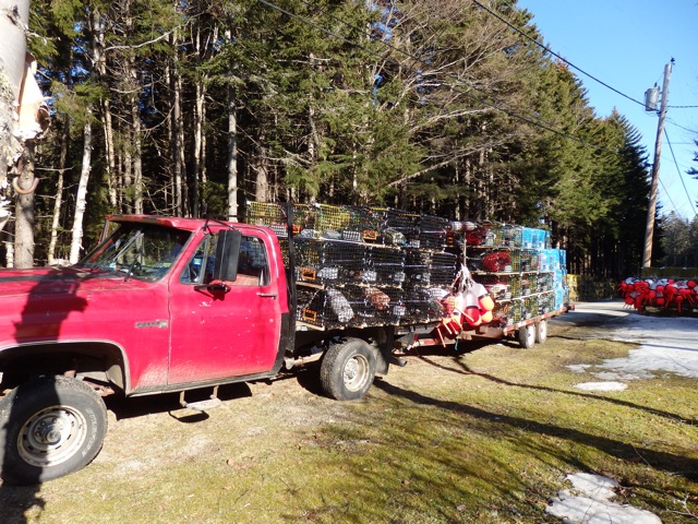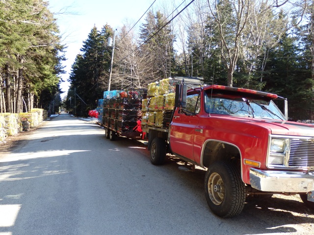 Bruce is out on the water as I am sitting in the library in N.E. Harbor, waiting for an appointment. Yesterday he asked if I’d take a photo of his lobster traps, ready to hit the water, to send to a fellow fisherman in Nova Scotia. Why not add them here as well, I thought. This is the first batch of what will eventually be 800 traps in the water. C’mon you hungry lobsters, start crawling!