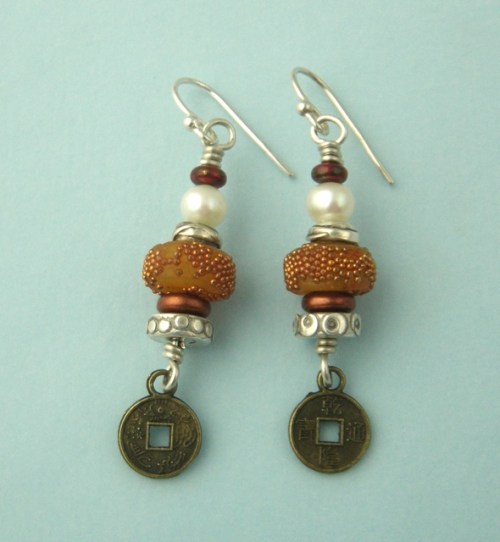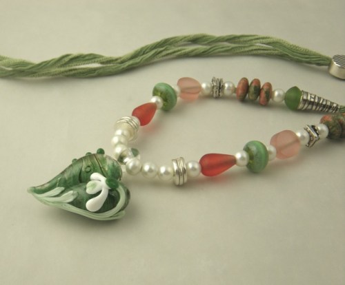 I love to make beads. I love to use beads made by others. If I had all the time in the world and could set up an area in my studio to do something new it would be to make lamp-worked (also called flame-worked) beads. I’ve tried it in a workshop and I know that learning to make these beautiful beads would take too much time away from my love of Precious Metal Clay. It would take years to develop the skills I want to have to make glass beads. So, there are a few glass bead makers from whom I buy regularly.
