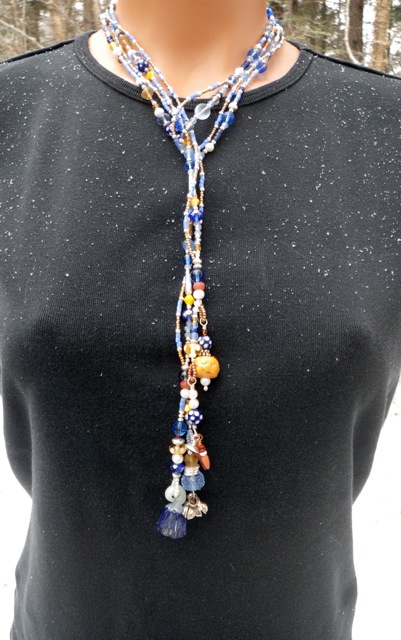 This is the only necklace without one of my metal scarab beads. Only because I haven’t yet worked on making some in bronze. You can see Sue’s scarab bead setting the tone for the bright colors in the necklace. There are glass beads made by a few other artists as well as the beach rock and sea glass that I drilled, and some African glass beads. The metal beads are ones I made from bronze metal clay.