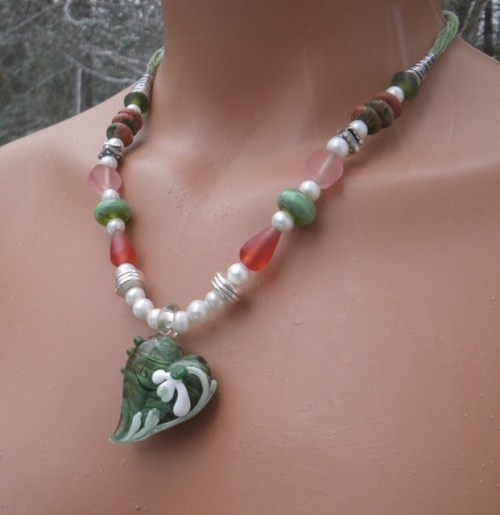 Below is one of my more traditional beach rock necklaces. I love how well Sue’s beads combine with the organic beads I make. Notice the other two pod-like silver beads. They are made with a mold I took from a goldenrod stem gall. (I’m always on the lookout for unusual things to mold. When I made the stem gall mold a few years ago I had to look it up to see what it was called!)