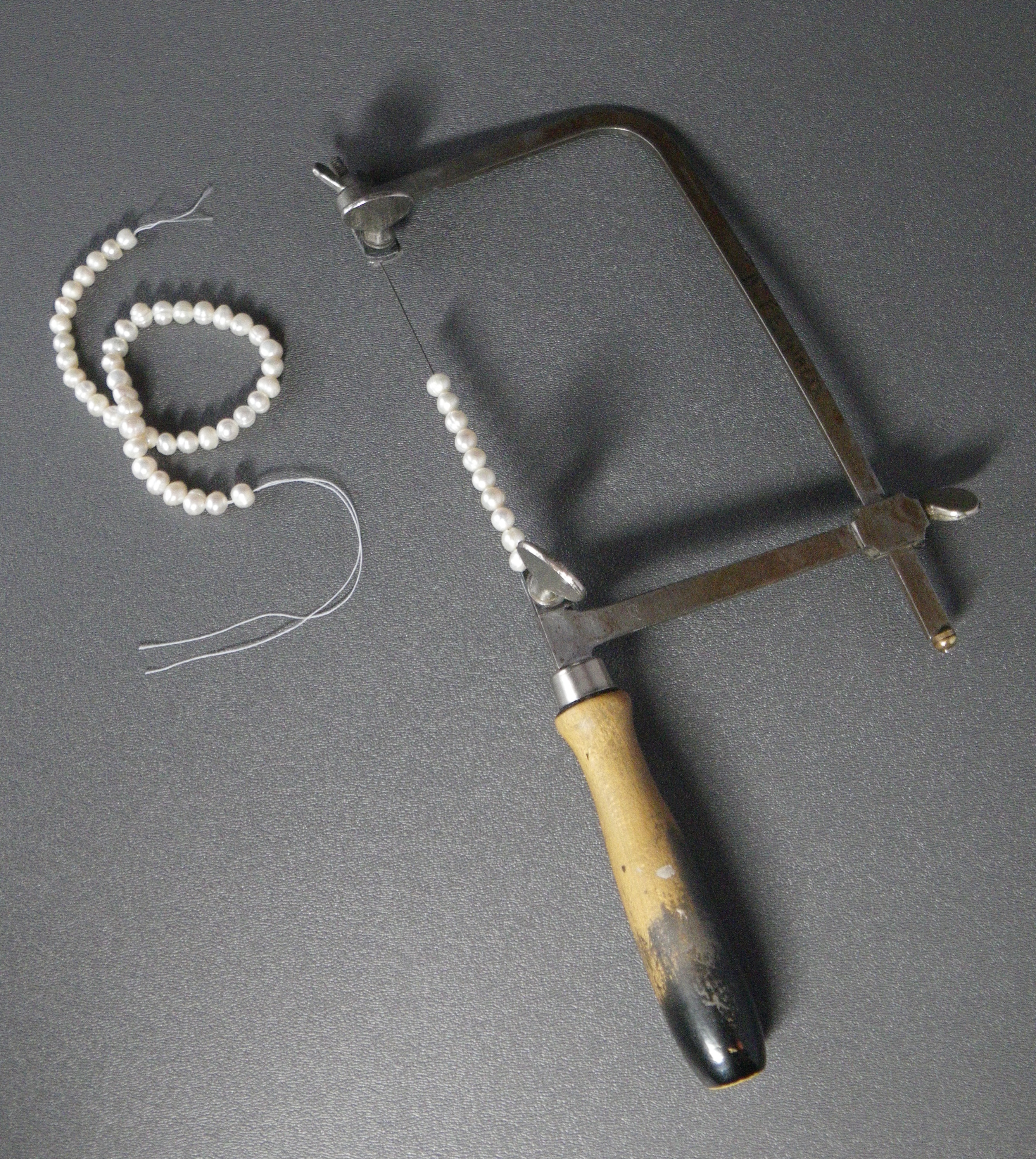 I devised a solution that works well for me, and it helps to hold several pearls in place as I work on them. I line them up on a smaller saw blade (1/0 or 2/0), place it in my jeweler’s saw, and saw in a little circle while holding each pearl. If the pearl slips out of my fingers, it is not going anywhere. I can pick up where I left off and just gently keep working at it. The best part is that it doesn’t require a lot of concentration. It is a “TV job” to work my way through enlarging the holes on a string of pearls. (Meaning I can watch TV while I’m doing it so it hardly feels like work.) It does help to keep a dishtowel or rag in your lap to collect the pearl dust.