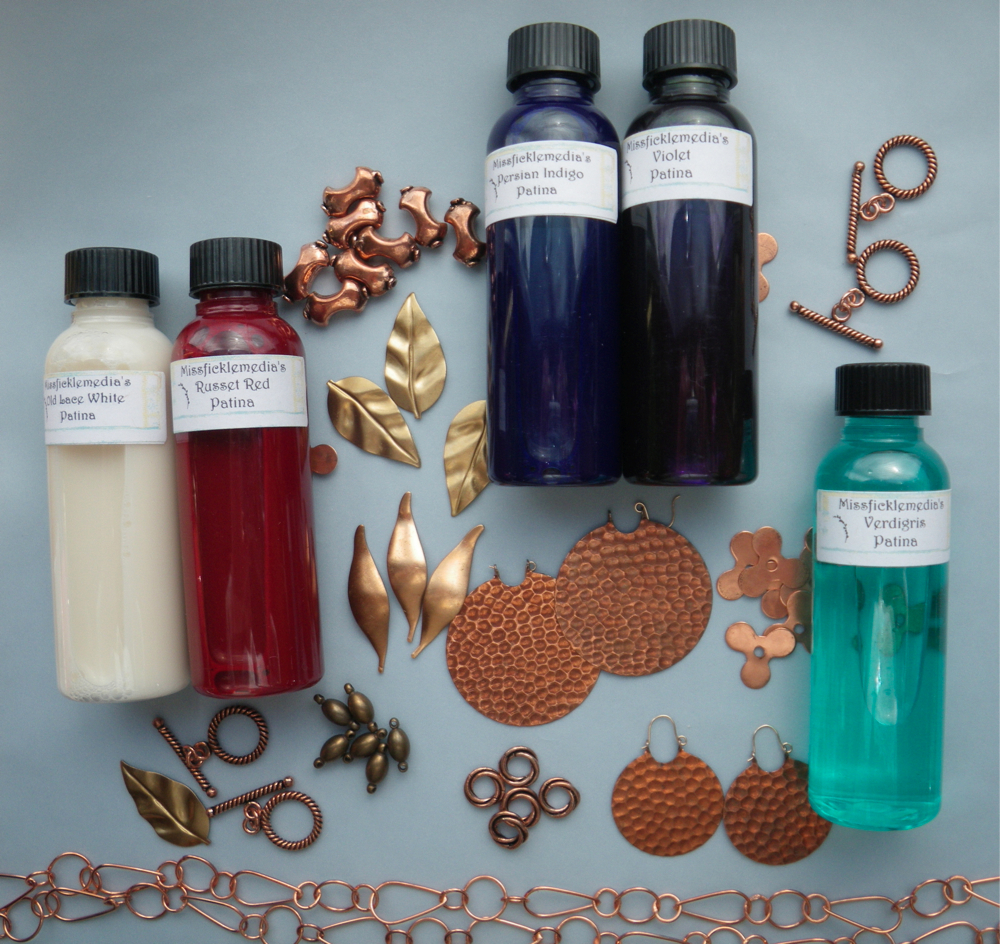 But first, I have ordered some patina solutions and an e-book from Shannon LeVart at Miss Ficklemedia. Her patinated beads and components fascinate me, and the process is one I’ve wanted to try for a while. I like the idea of creating my own colors on copper and brass to use in my necklaces and earrings. I will use silver, too, but I can stretch my silver supply a little farther when I combine it with other metals.