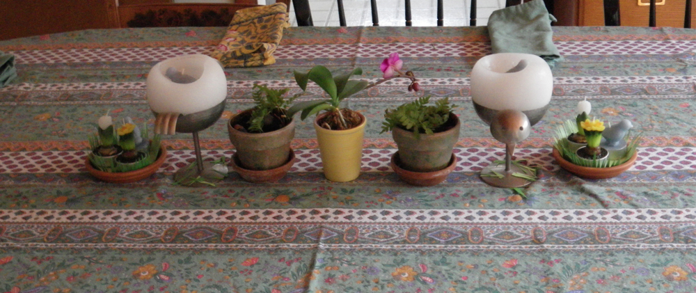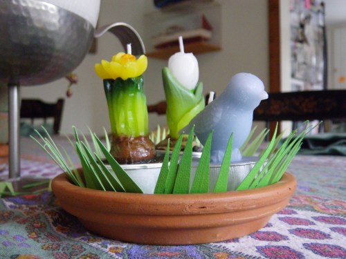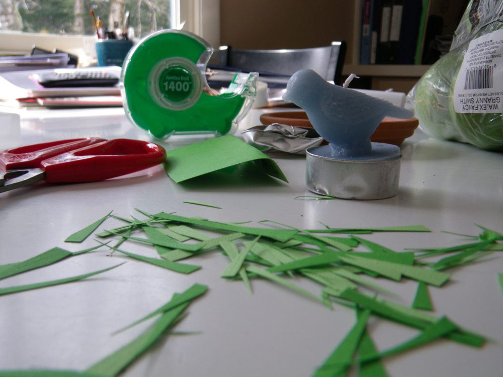 Getting ready for this makes me nervous. And we have a house guest coming today. And we will have 10 people for dinner tonight. I’ll wait for everyone to go to bed and then cram for tomorrow’s “test.” In the meantime I’m cleaning the house, getting the table set for dinner, making bread, making salad, and making dessert. My body responds to the anxiety about tomorrow by going in several directions at once. It’s not enough to just set the table for dinner. I want to create a little springtime centerpiece. Next thing I know, I’m making my own grass out of green paper.