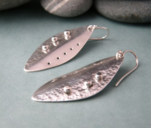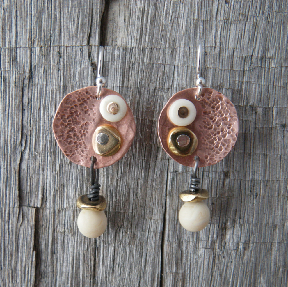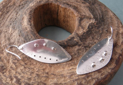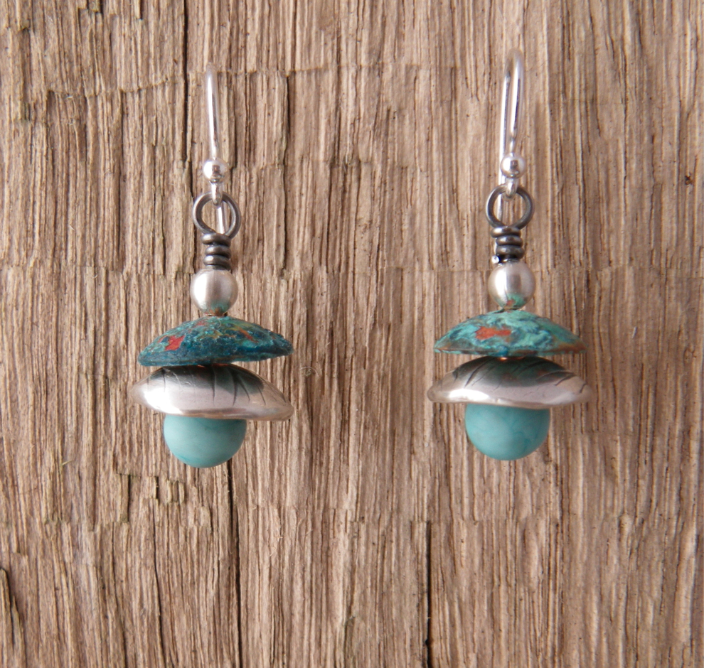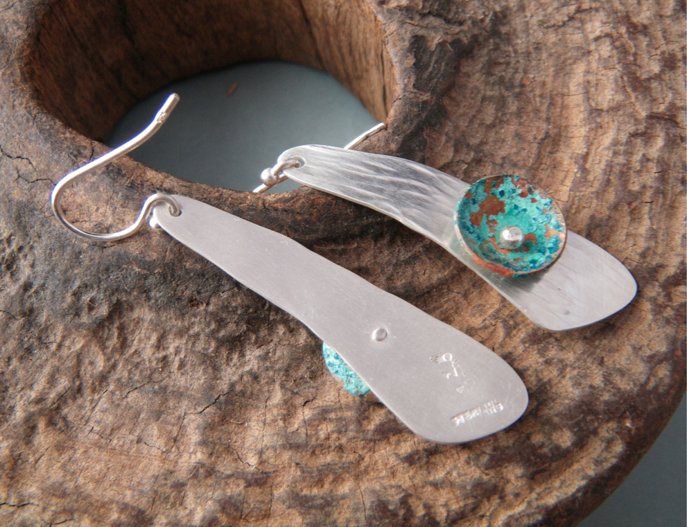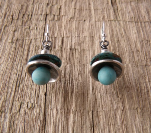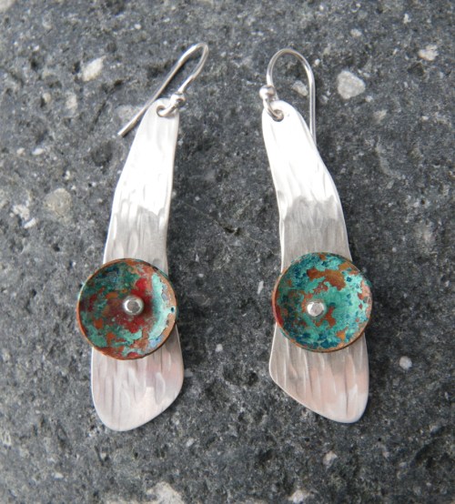 Silver was $36.97 today. Yikes. The cost of silver clay has become prohibitive. I’ve started thinking about sheet metal and simple fabrication. After an experiment with patina on copper discs, I decided to rivet them to some earring shapes I had cut from sterling silver sheet. I hammered the silver and gave it a hand finish, rather than a high polish. Not sure if I like the concave discs on this particular pair. The shape is from a template I made for toggle clasps, but it works out pretty well for an earring too.