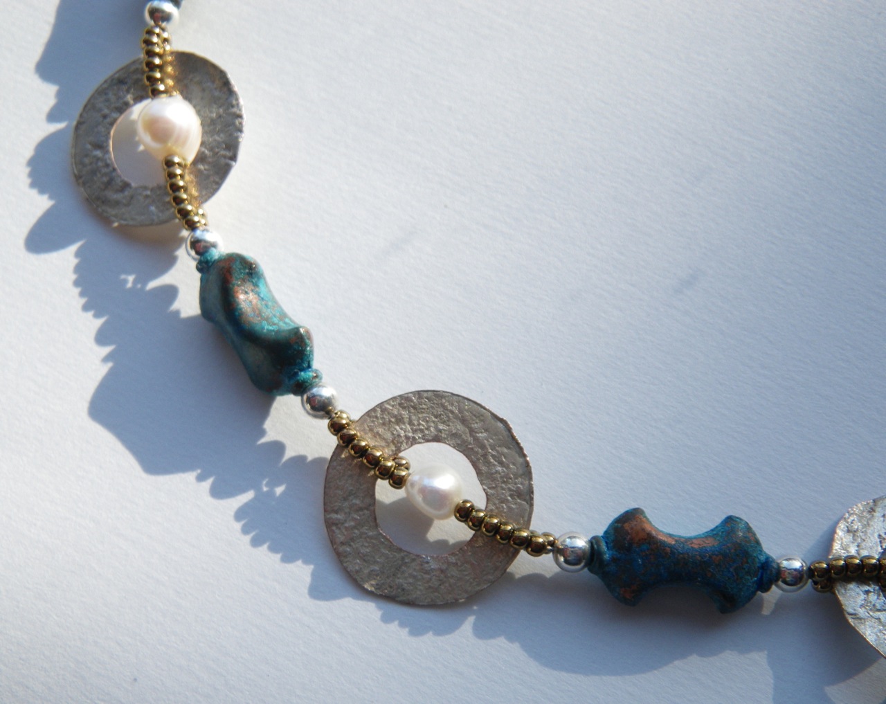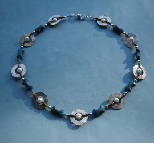 I had some copper discs lying around…. and I’m waiting to learn more about patinas….but I just want to keep riveting! Check out Sue Kennedy’s off-white glass head pins below. The white disc inside the rivet is some kind of bone. (I think.) Sterling silver and gold filled head pins are used as rivets.