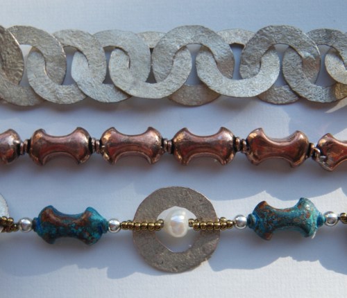 I love the colors in the copper so much, that I decided to learn more about it. I’m waiting for the arrival of some patina solutions from Shannon LeVart at Miss Ficklemedia. The pdf file for the Color Drenched Metal tutorial is well written and looks like it will be easy to follow when my supplies get here next week.