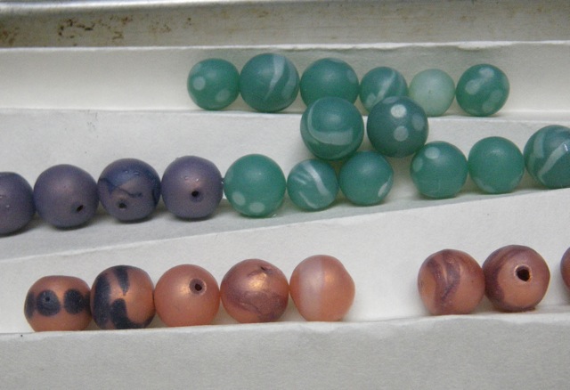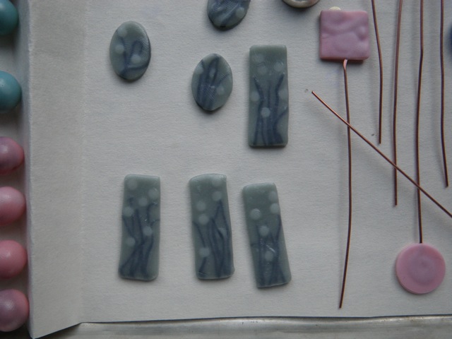 The time went all too quickly. Two morning sessions were just enough to whet our appetite for more polymer clay exploration. We were having too much fun to stop and take photos of it all. Here are two more test pieces, with beads added to the waxed linen before squeezing the two sides of polymer together. In my mind they would be earring components.