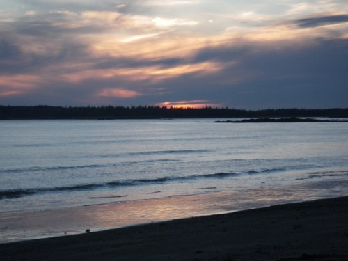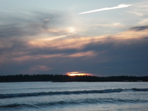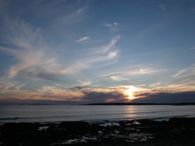 I took the 4 p.m. boat off of the island, and hoped there would be enough light to still read my book on the way to N.E. Harbor. There was enough for 5 minutes or so. Suddenly, Tiffany, who was sitting next to me , whipped her head around to look behind her and said, “Oh my god!” Â It took a second for each of us to grab our cameras, and run out to the stern of the boat. Where there were more passengers, mostly workmen, and many with their phones out snapping the same photo we were.